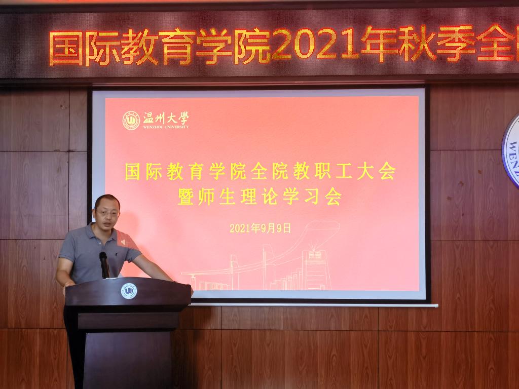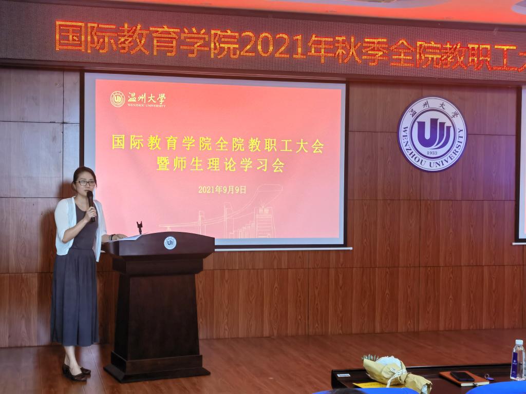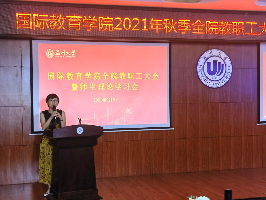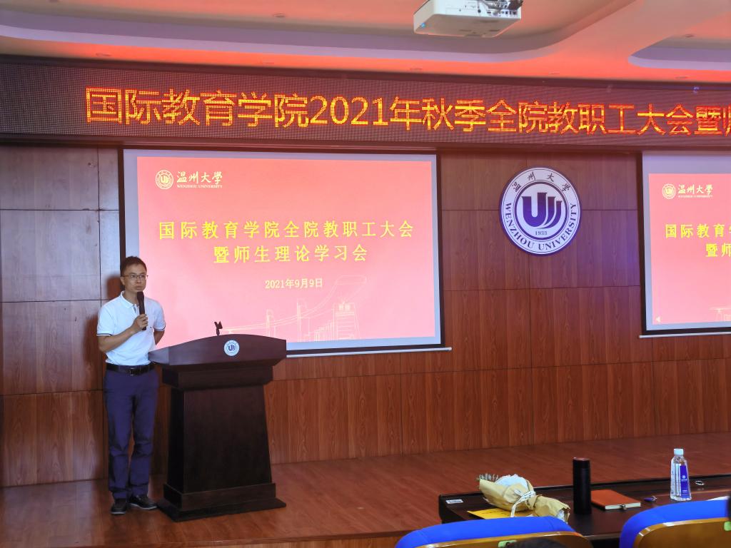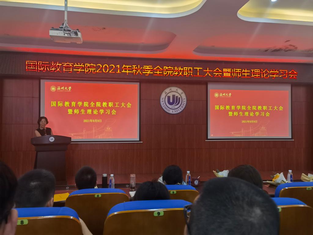 2021年9月9日下午,买球的app排行榜前十名推荐2021/2022第一学期新学期全体教职工大会暨教工理论学习会在国际楼203报告厅召开,会议由党总支书记林爱菊主持。