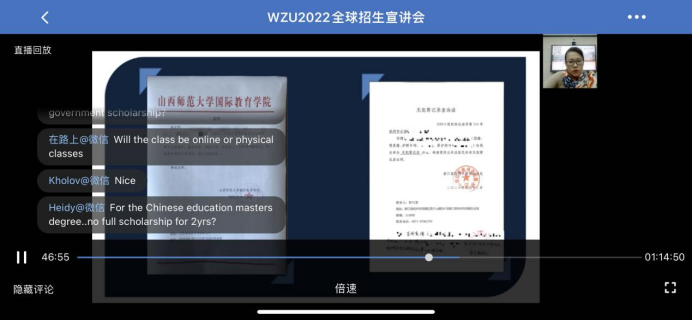 本次宣讲会是为2022年秋季入学国际生招生做的首场线上直播宣讲会。会议由合作单位通过企业微信邀请意向申请人参加。观看本次线上直播的累计有240人次,收到评论176条。本次见面会为今后的线上宣讲会积累很好的经验,在未来我们会陆续推出不同主题的见面会,让更多的学院参与到招生宣传中来,让学生更直接地面对学校,了解专业,让学校和学生开展双向选择,让更多的优秀学子能够来到十大正规买球的app排行榜学习。