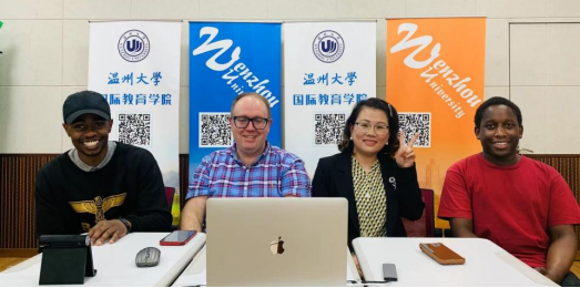 镜头随后切换到由唐风教室设备搭建的直播现场。此次直播团队由留管部招生科Trenton、池轶文老师以及特邀留学生代表陆求是(LUHWAGO JOSHUA CHARLES)、睿君(MAJONI ISHEMUNYORO RAYMOND)四人组成,他们逐一入镜介绍、分享留学温大的信息。