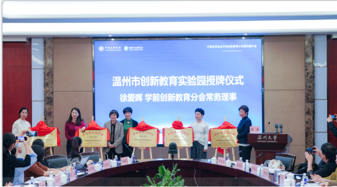 中国发明协会党委副书记、副理事长贺振福公布新一批理事会成员、实验园名单,并由原温州市教育局普教处副处长徐爱晖为九所温州创新教育实验园授牌。