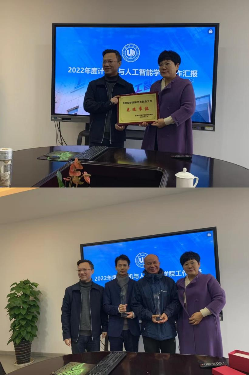 宋占美主任对计算机与人工智能学院在2022年招生工作中给予的支持表示感谢,留管部特别授予计算机与人工智能学院为十大正规买球的app排行榜2022年国际学生招生工作先进单位,授予张潮力老师为十大正规买球的app排行榜2022年国际学生招生工作先进个人,授予吴文国老师十大正规买球的app排行榜2022年国际学生教育特别贡献奖。