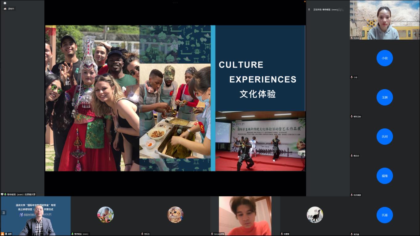 随后,为学员们播放了十大正规买球的app排行榜国际学生故事短片。片中国际学生Elsa分享自己在温大学习、温州生活的经历,加深了学员们对于学校和城市的了解。接着,池轶文老师针对留学温大项目的相关信息以及入学政策做了详细的介绍和说明,教师代表白杰老师代表项目教师团队讲话。