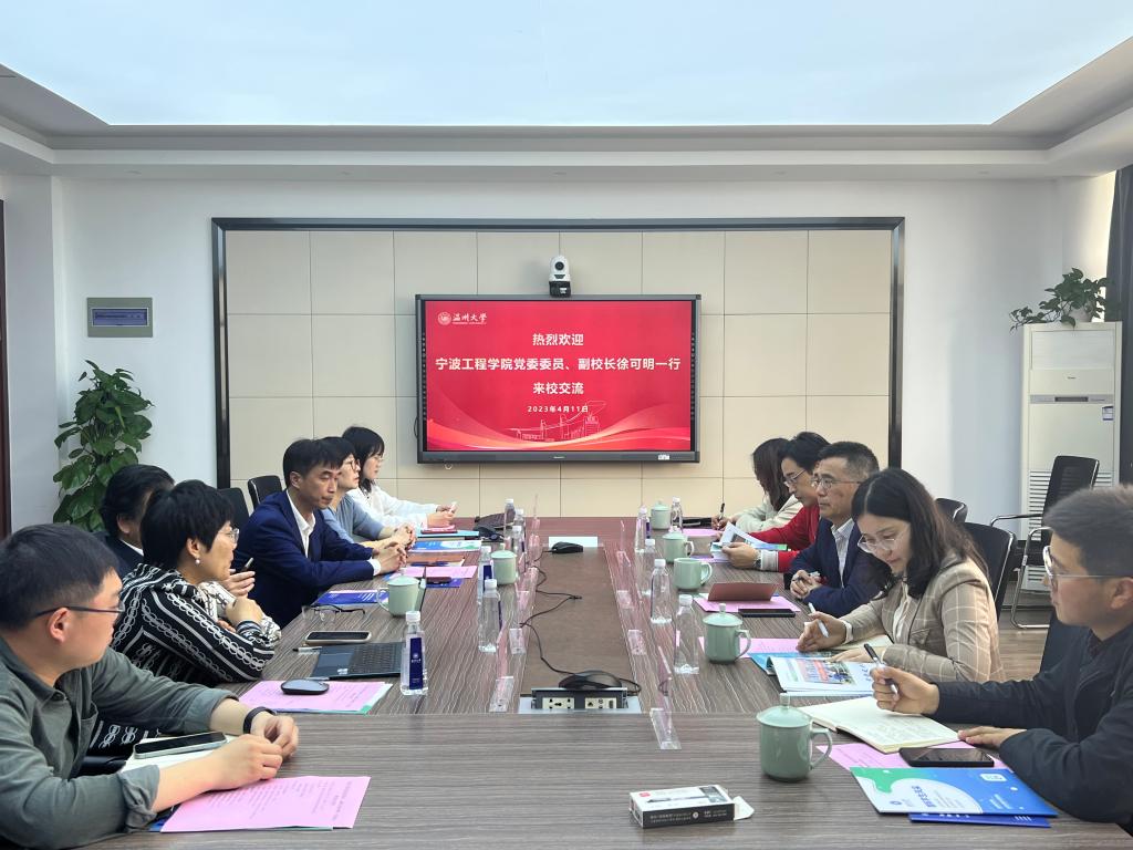 4月11日下午,宁波工程学院副校长徐可明一行来我校交流座谈,副校长蔡曙光、国际交流与合作处处长黄文浩、买球的app排行榜前十名推荐院长宋占美、党总支书记林爱菊、学工办主任刘天和辅导员程玲参加座谈。