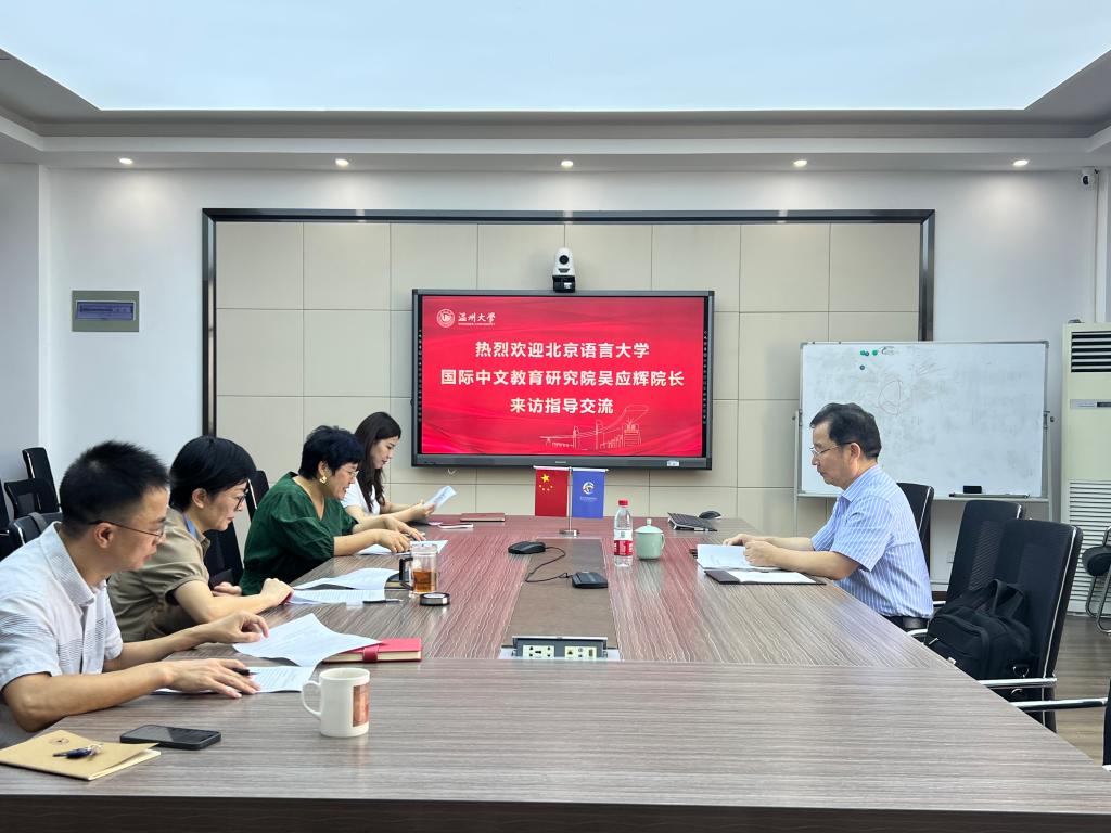 8月20日上午,北京语言大学汉语国际教育研究院院长吴应辉教授受邀来买球官网开展指导交流。院长宋占美、书记林爱菊、副书记方建晓、院长助理黄雅琳、办公室主任李舒琦参加了本次交流会。