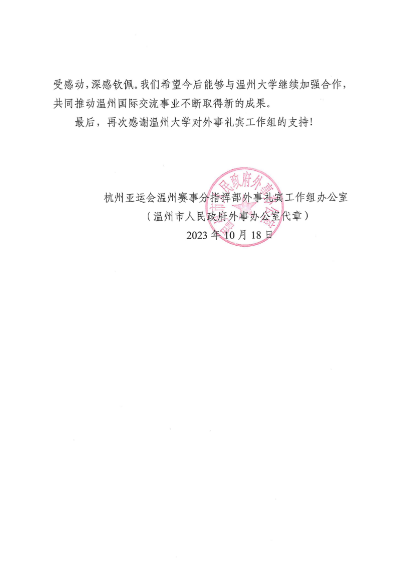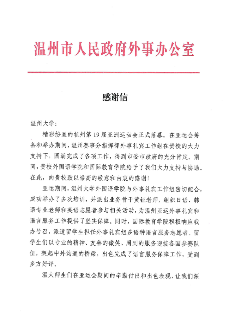 近日,我校收到温州市人民政府外事办公室专程发来的感谢信,信中对我校国际学生志愿者在第19届杭州亚运会中出色的语言服务保障工作表示充分的肯定以及衷心的感谢!