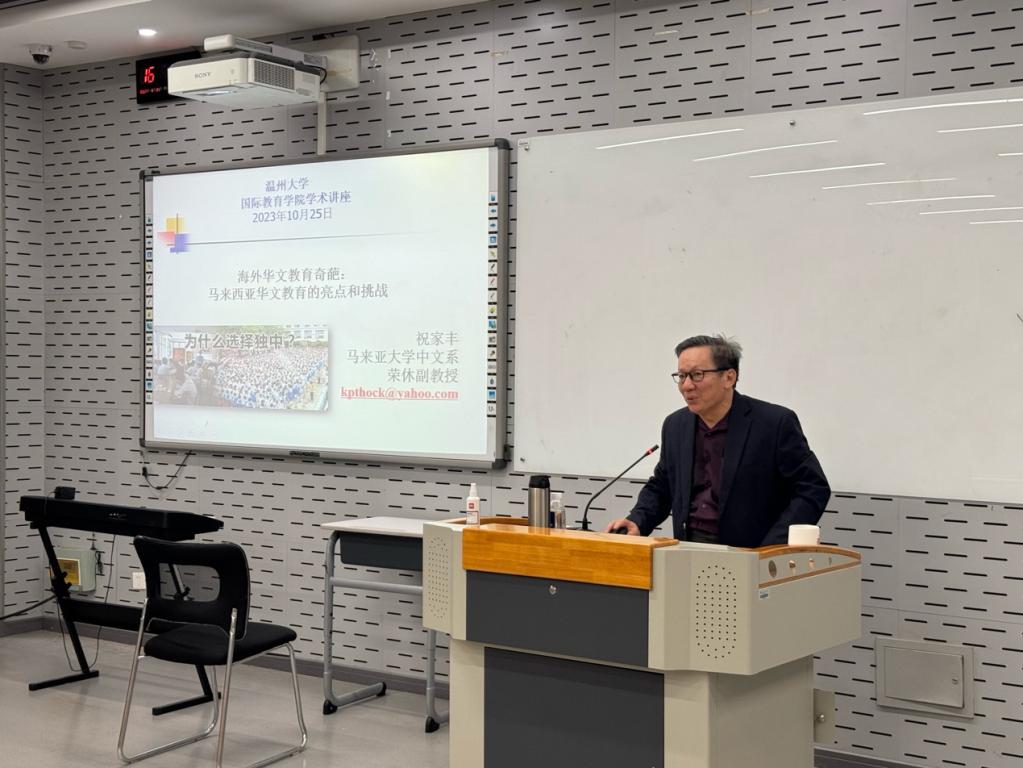 2023年10月25日下午,来自马来西亚马来亚大学的祝家丰教授应邀在买球官网北3-201报告厅作题为《马来西亚华文教育的政策及其实践》的学术讲座。讲座由买球官网办公室主任李舒琦主持,买球官网教师及汉硕研究生参加了讲座。