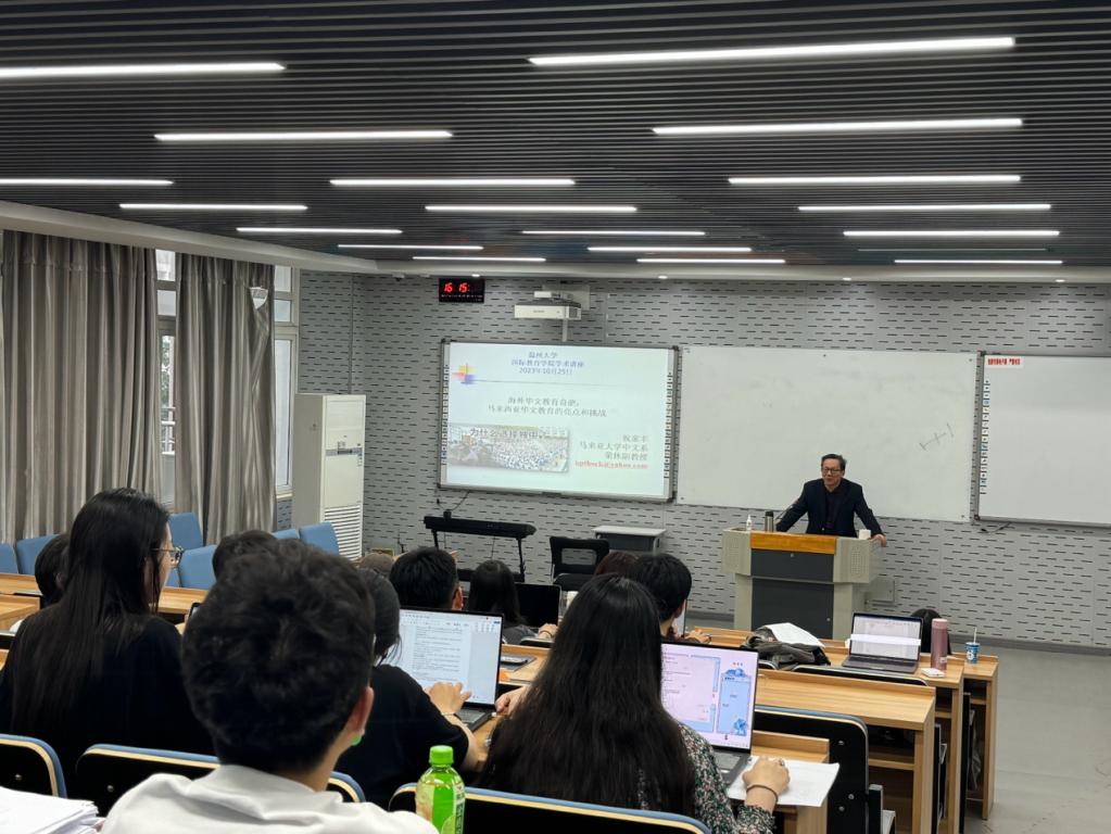 祝家丰教授从马来西亚的多年教学研究的实践中,分享了对马来西亚华文教育的亮点和挑战。祝教授首先介绍了马来西亚华文教育的情况,提到马来西亚的华文教育体系在中、港、台外是发展得最完善的国家或地区,并且由于华文小学优质的教学质量,绝大多数的华裔家长都会将子女送进华文小学。接着祝教授介绍了华文教育的历史进程,马来西亚华人具有儒商精神,饮水思源,社会各界人士在面对政府的高压下不畏强权,为华文教育奋斗一生。最后分享了马来西亚华文教育的现状以及挑战,如政府颁布了一系列不发展华语教育的政策,华文教育还需要面对国际大环境、英语至上的挑战等等,引发了老师同学们的思考。