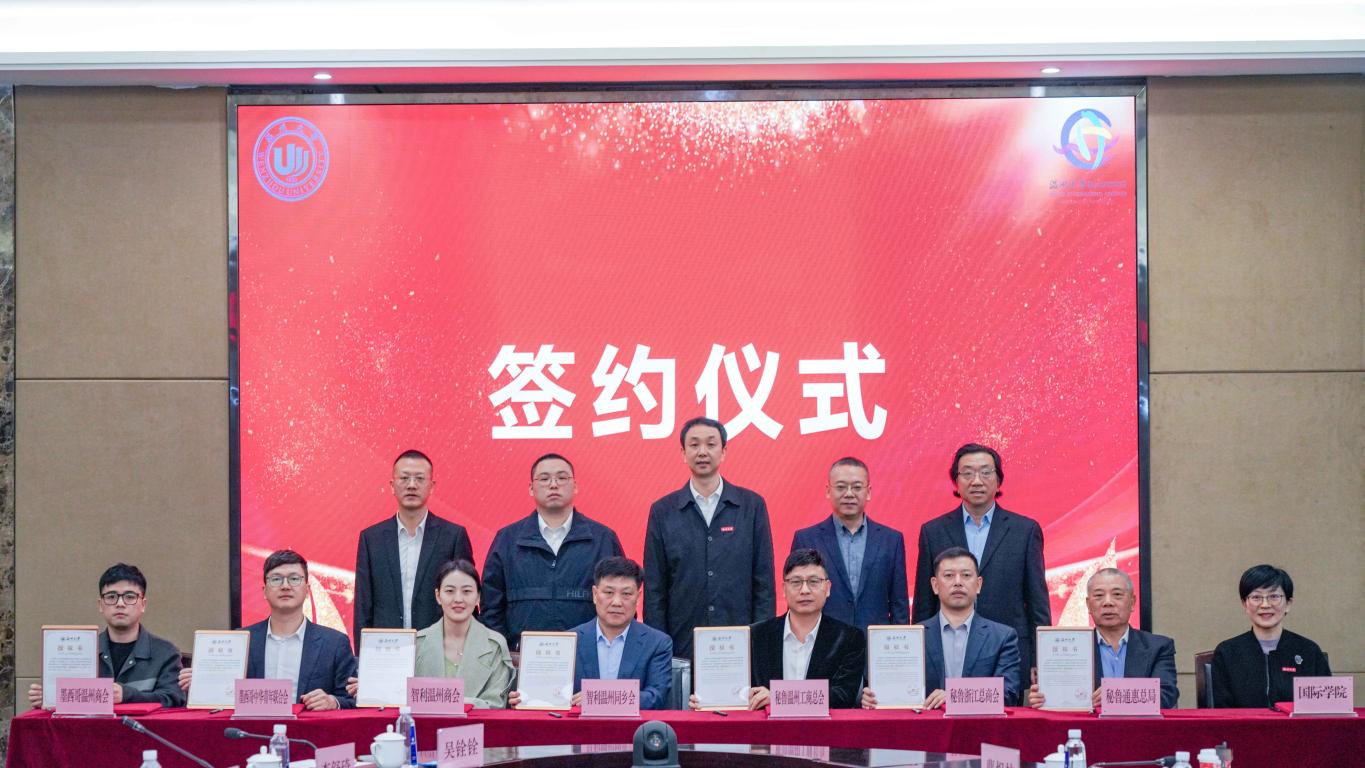 最后,在市、区侨联领导和校领导的共同见证下,买球的app排行榜前十名推荐党总支书记林爱菊与秘鲁通惠总局主席沈达坚、秘鲁浙江总商会会长楼兵强、秘鲁温州工商总会代会长张剑英、智利温州同乡会名誉会长林良松、智利温州商会副会长吴宾洁、墨西哥中华青年联合会副会长陈温畅及墨西哥温州商会副会长林浩敏等7位侨团代表一同签署了合作协议,并为各位代表颁发开展“留学温大”招生宣传相关工作的授权书。