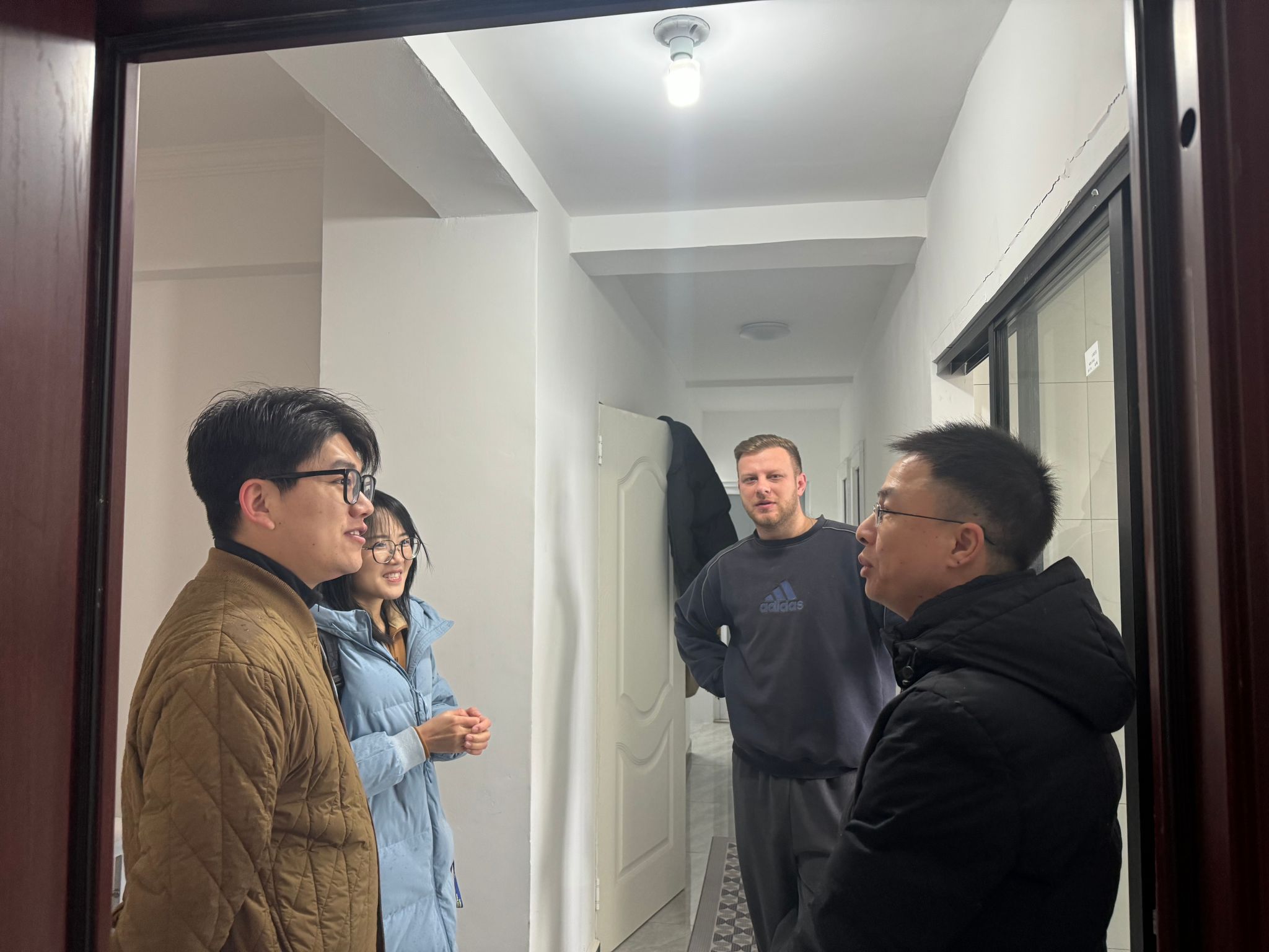 当日下午,辅导员们分组驱车前往留学生居住的各个社区与公寓。踏入留学生们的住所,温馨的交流随即展开。“房间够不够热?平时采购生活 用品方便吗?” 辅导员们一边查看居住环境,一边关切询问,细致入微地了解留学生的居住条件、生活设施使用情况以及周边生活配套。来自俄罗斯的留学生罗曼笑着回应:“住在这里很舒服,社区的邻居们都很友善,还教会我使用各种便捷的生活 APP。”