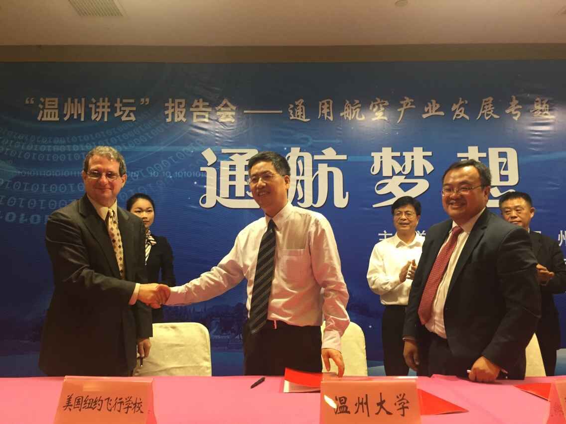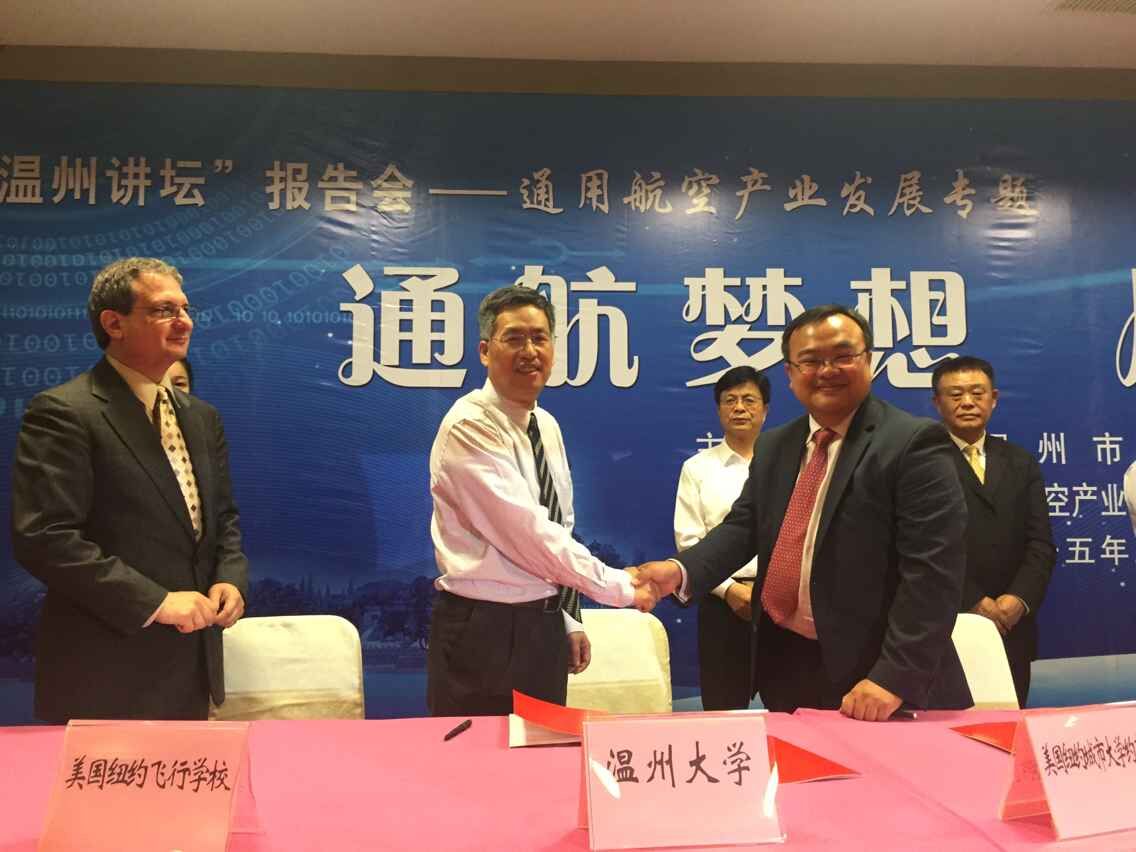 5月19日下午3点,在市委书记陈一新等市领导的见证下,十大正规买球的app排行榜副校长黄少铭分别与美国纽约飞行学校和美国纽约城市大学约克学院负责人签署合作协议,以中美合作培养的方式开展通用航空飞行员私照、商照培训和飞行技能与学历教育相结合的各种复合型通用航空人才的培养。本次签约仪式是我市开展通用航空产业发展“五个一”系列活动之一,是以“通航梦想,从此起飞”为主题的通用航空产业发展专题“温州讲坛”报告会的重要议程。