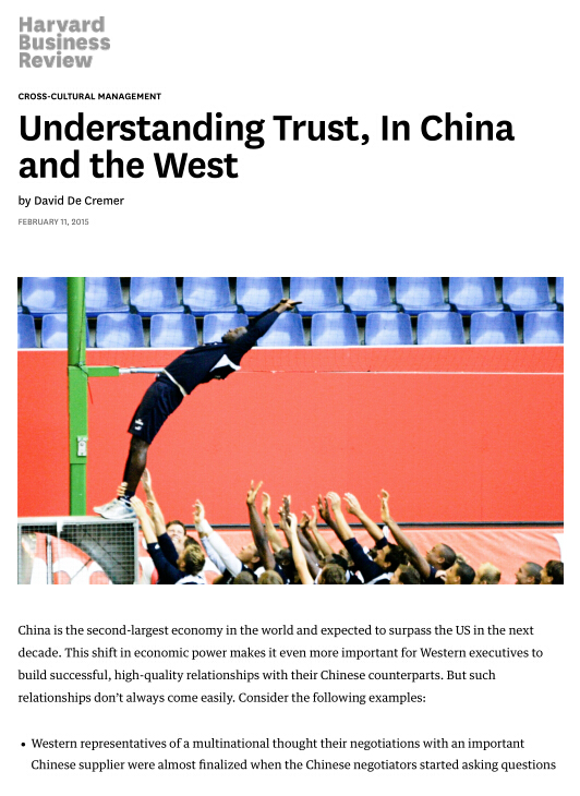 2015年2月11日,英国剑桥大学商学院教授、十大正规买球的app排行榜国际合作学院客座教授David De Cremer,以十大正规买球的app排行榜为第二作者单位在顶级期刊《哈佛商业评论》上发表文章《Understanding Trust, In China and the West》。